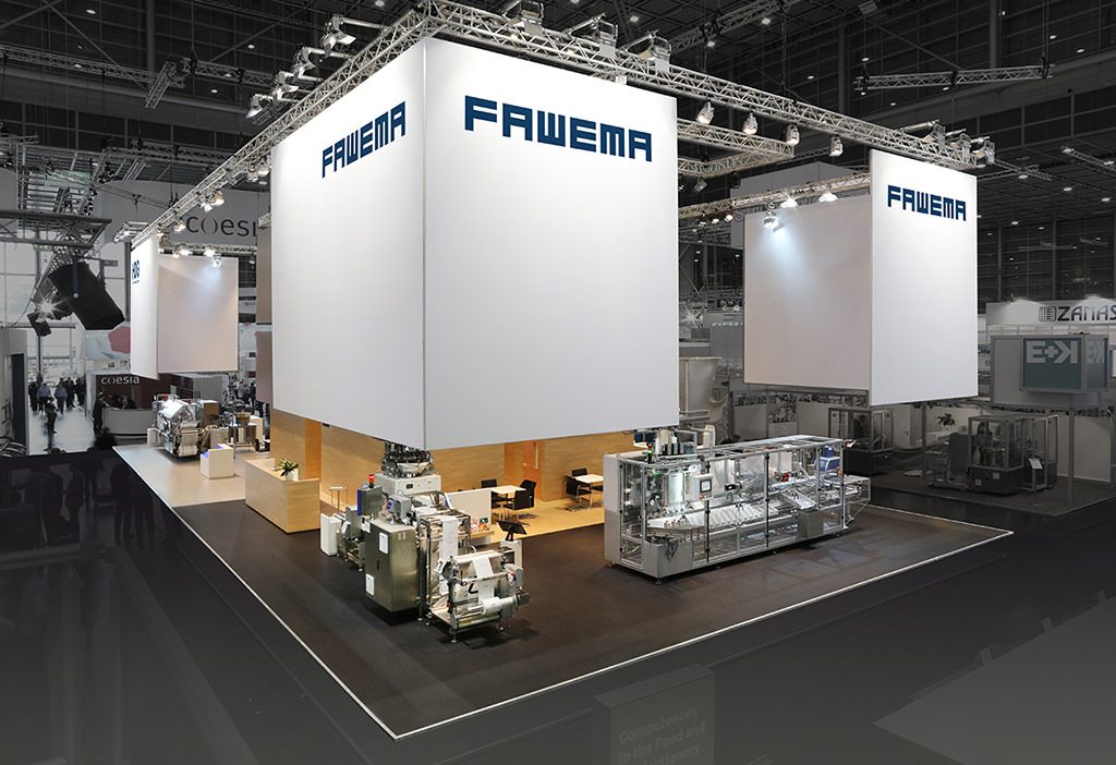 Die Klammern, die für den Zusammenhalt der beiden Firmen FAWEMA und HDG stehen, grenzen die Standfläche von den Nachbarständen ab. Zudem fassen sie das kubische Gebäude in der Mitte der Fläche ein, in dem sich die gemeinsame Infrastruktur befindet.